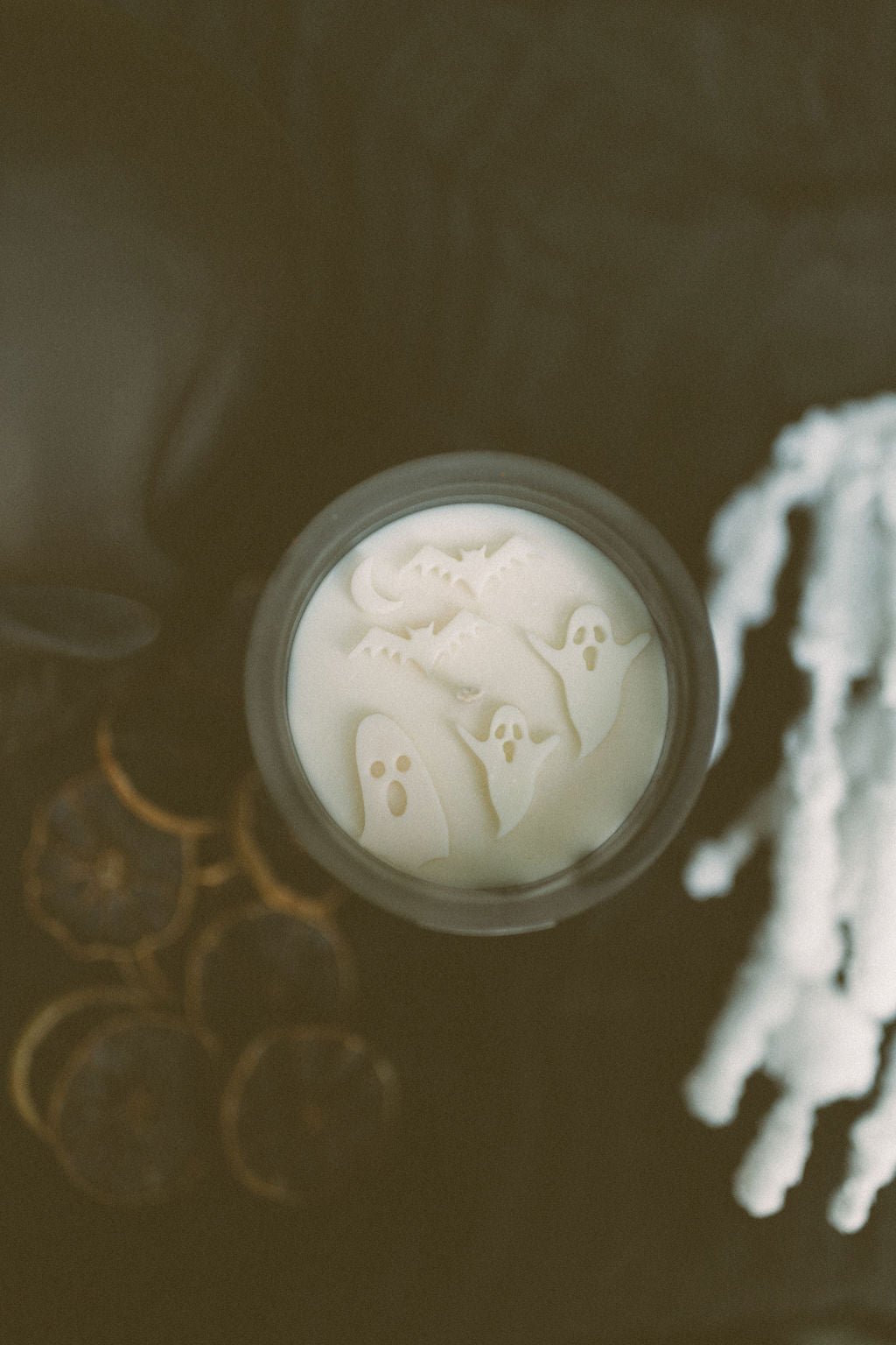 Tonal wax ghosts adorn top of candle